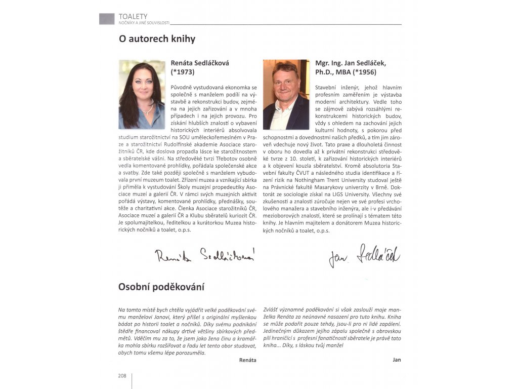 Manželé Renáta a Jan Sedláčkovi se věnují sběratelství nočníků, toalet, předmětů souvisejících s tělesnou hygienou a vyhledávání nových informací v tomto oboru od roku 2000, kdy zakoupili zchátralou středověkou tvrz. Během vlastního stavebně-historického průzkumu v ní objevili jedny z prvních toalet na našem území, v odborných kruzích vysoce ceněných. Tento nález byl impulzem k jejich pátrání po tom, kam lidé v různých historických obdobích chodili na toaletu, jaké k tomu používali nádoby, jaká místa si stavěli pro tyto účely a jaké budovali systémy pro likvidaci tělesného odpadu. Kromě toho se autoři ve svých teoretických pracích zabývají též lidskou hygienou nejen z aktuálního environmentálního hlediska, ale i s výhledem do blízké budoucnosti.